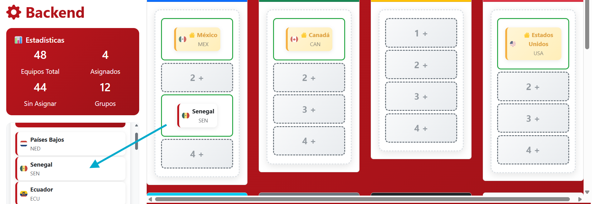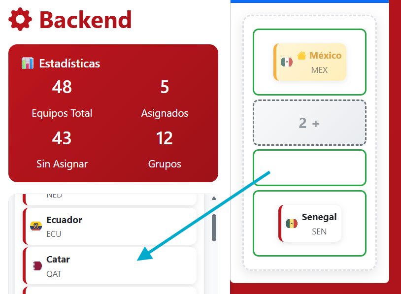 - Intenta poner Senegal en la tercera posición, es decir, donde antes estaba Catar. Fíjate que ahora se duplica el equipo (Ver captura: Ejemplo equipos duplicador).