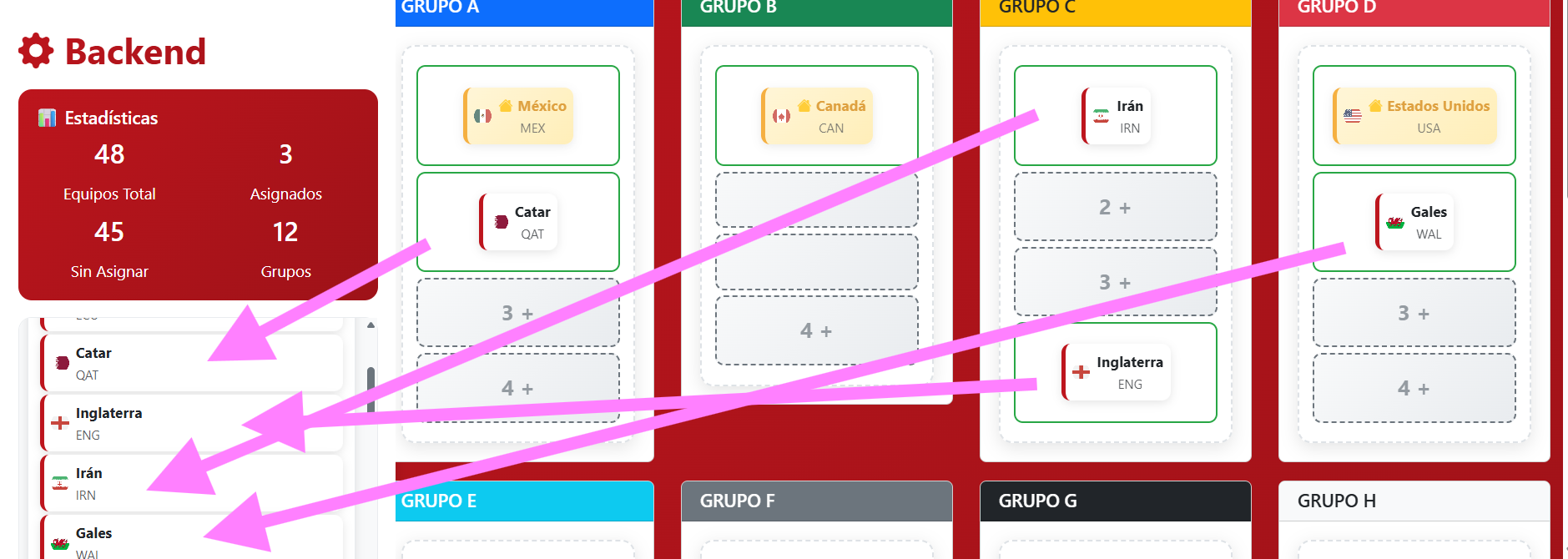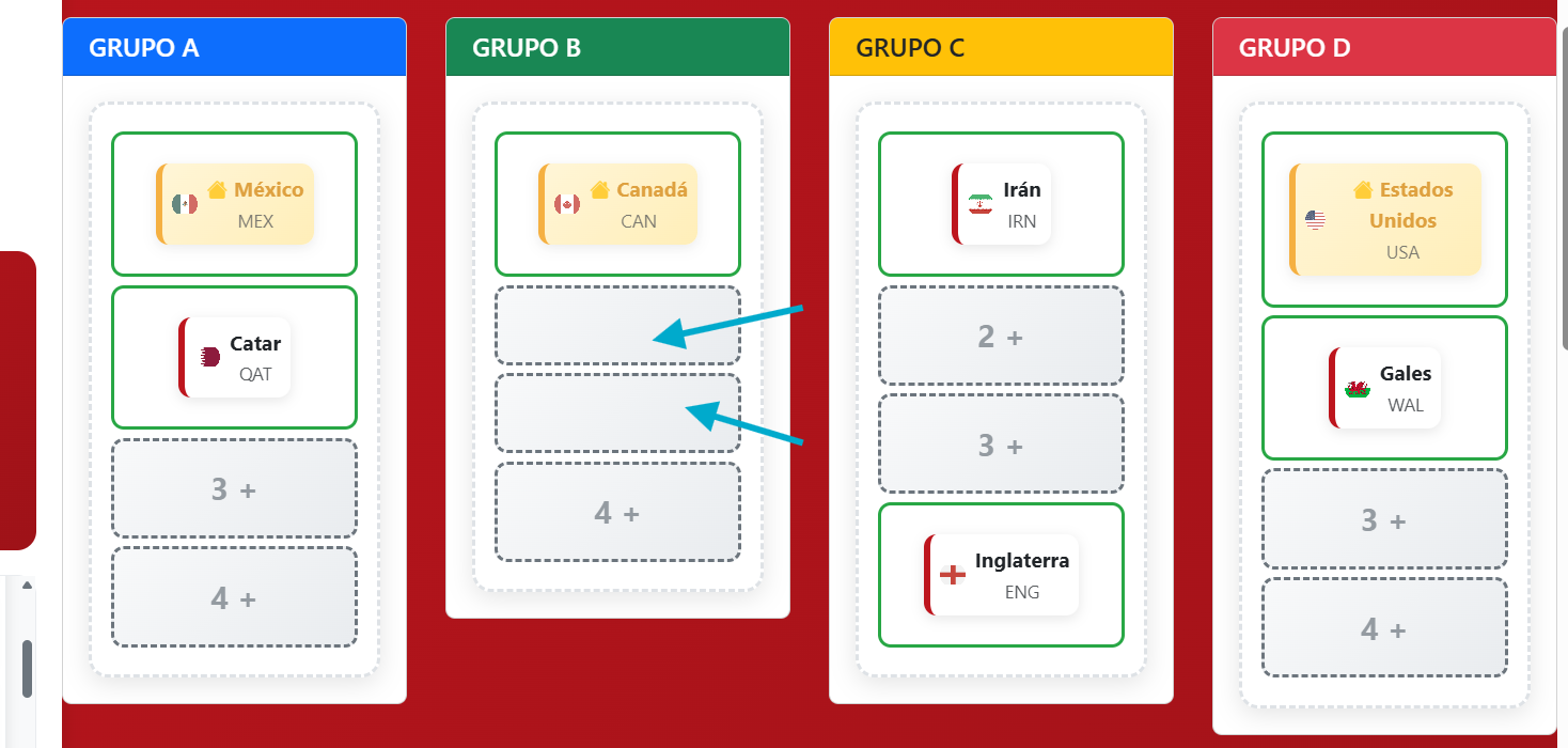 2) Que ahora se pueda agregar un equipo a un grupo, en una posición específica (una de las 4 existentes que hay por equipo). Así mismo, también funciona volver a quitar el equipo rápidamente, en caso que se haya cometido un error.