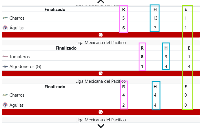 Compartimos unos detalles sobre partidos finalizados y NO iniciados en béisbol. Noten que los dos equipos parecen estar entrados entre ellos, más no alineados según el espacio de la caja. (Ver captura)