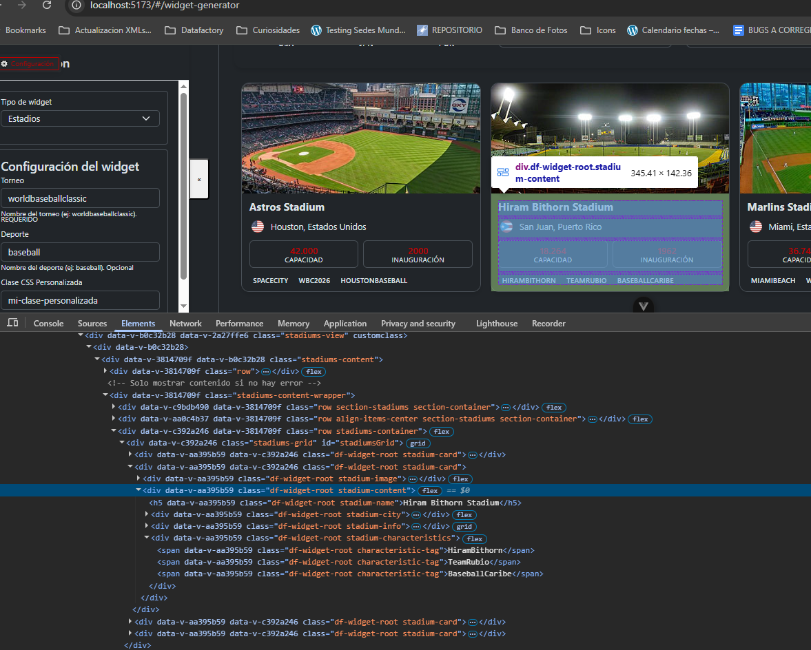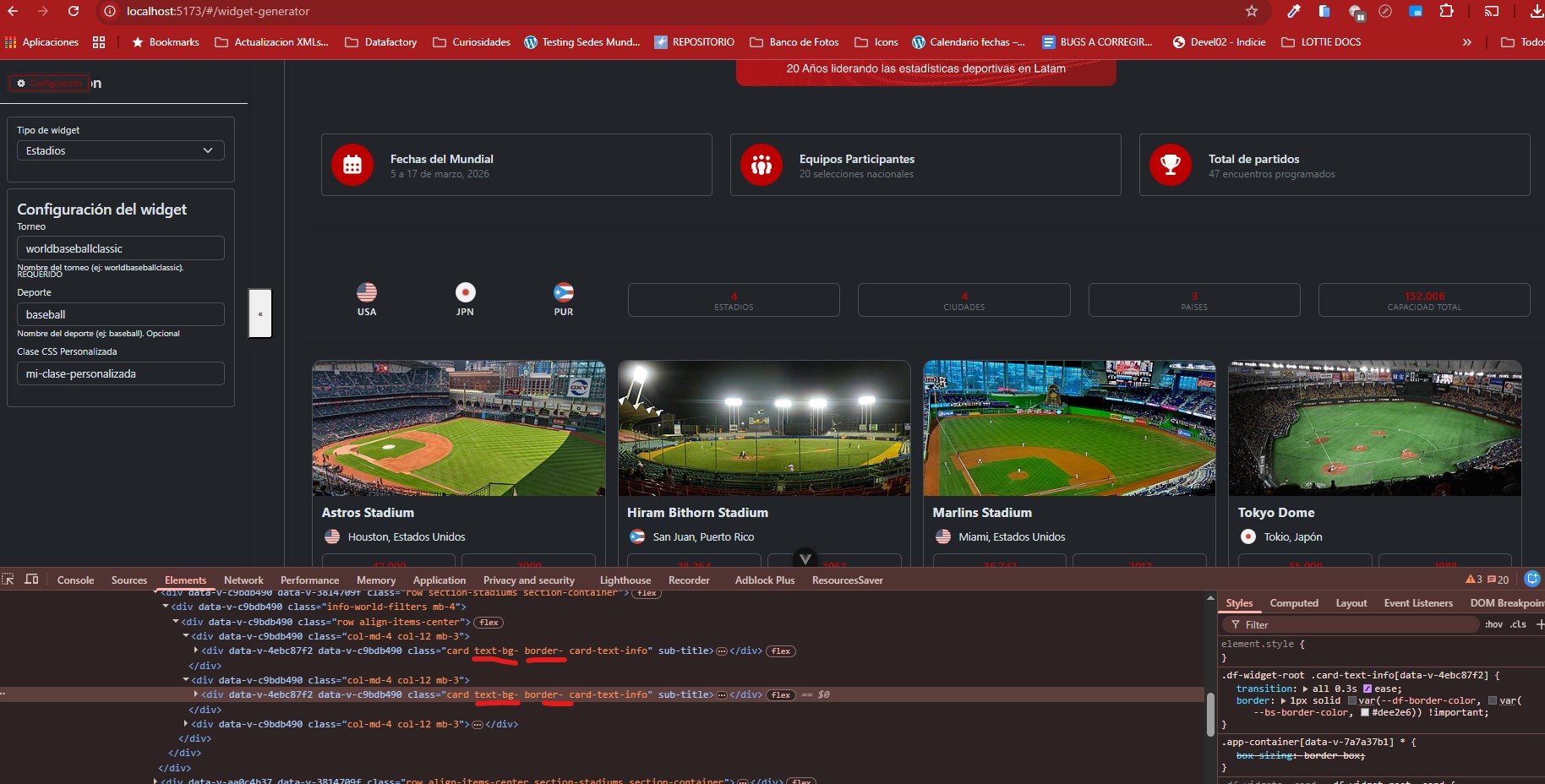 Saludos, ya los estilos están separados por cada componente del widget como se estableció, adicional que están las clases en inglés, Se añadió el modal con la info de cada estadio de acuerdo a lo actual del excel y sus traducciones correspondientes.